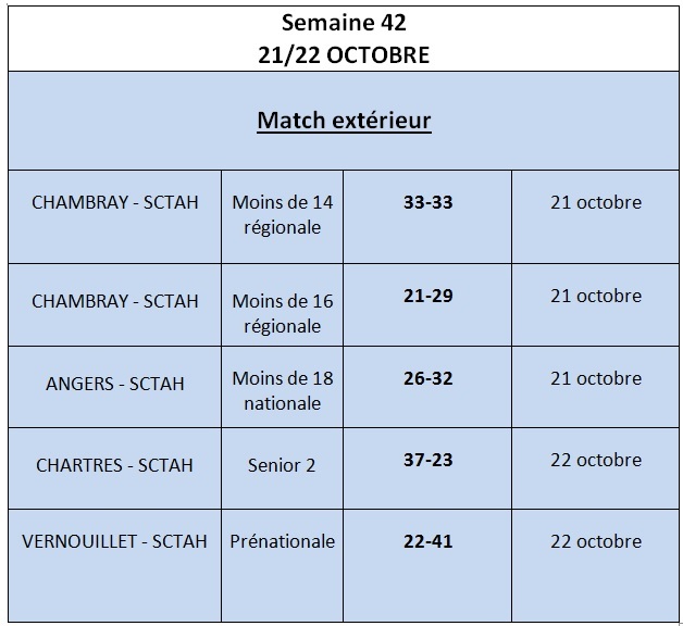 Voici les résultats du week-end. Aucun match pour la semaine à venir.